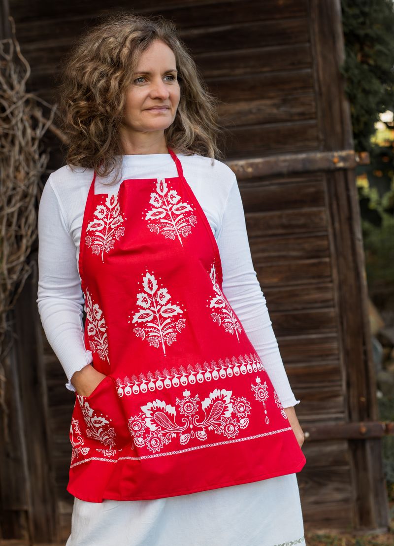 Bavlnená krátka zásterka s folklórnym motívom, vhodná do kuchyne, do tvorivej dielne, do záhrady.