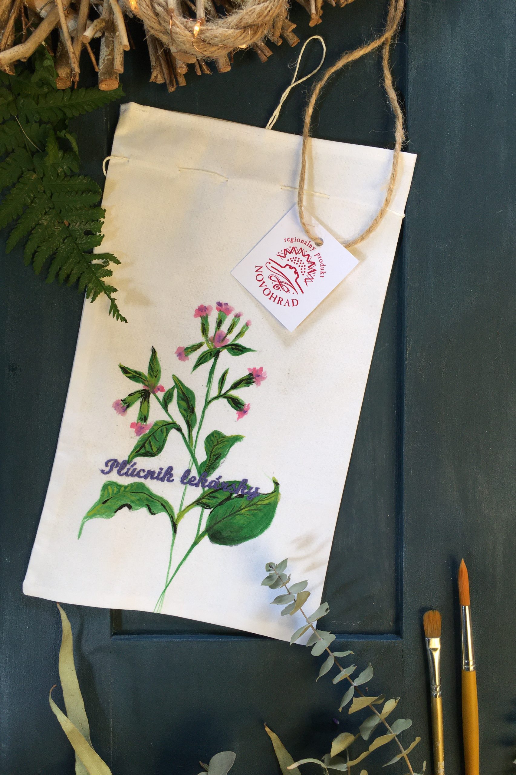 Vrecúško na pľúcnik lekársky s maľovanou rastlinou a s vyšívaným názvom byliny poslúži na uskladnenie vašej sušenej lekárne, ktoré zároveň ozdobí domov vo vidieckom štýle.