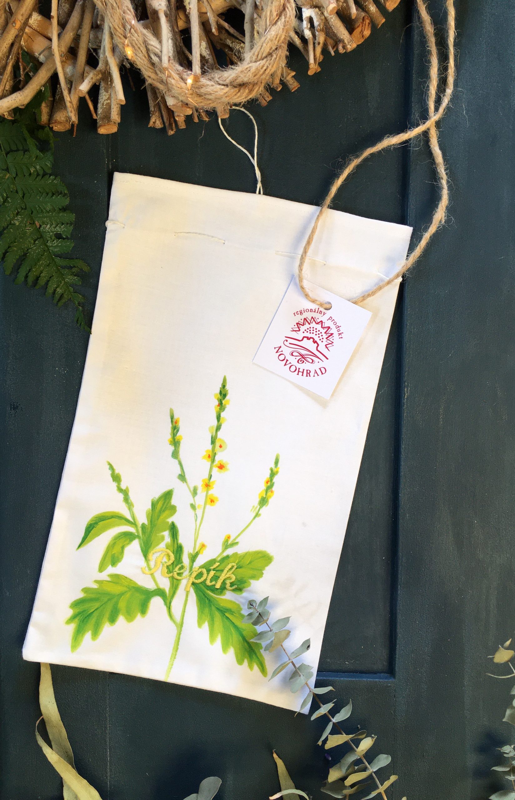 Vrecúško na repík lekársky s maľovanou rastlinou a s vyšívaným názvom byliny poslúži na uskladnenie vašej sušenej lekárne, ktoré zároveň ozdobí domov vo vidieckom štýle.