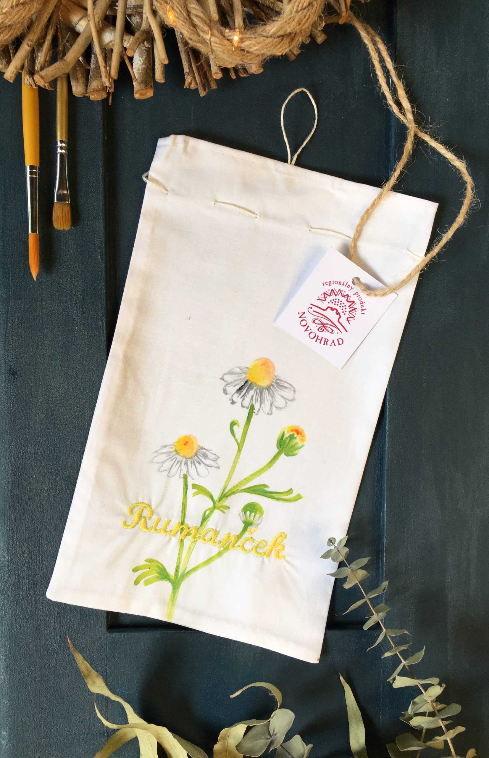 Vrecúško na rumanček s maľovanou rastlinou a s vyšívaným názvom byliny poslúži na uskladnenie vašej sušenej lekárne, ktoré zároveň ozdobí domov vo vidieckom štýle.