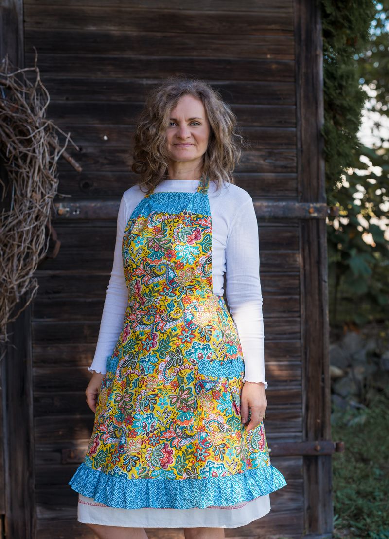 Bavlnená zásterka s pestrofarebným vzorom inšpirovaným folklórom. Zástera pre kuchynské gazdinky, vášnivé záhradníčky, či kvetinárky, ktoré sa túžia cítiť i pri práci, vo svojej kreatívnej dielni alebo záhradnej párty romanticky. Je ušitá z bavlnenej látky, dozdobená fodrou, vrch podšitý, na zaviazanie okolo pása a okolo krku, s dvomi vreckami.